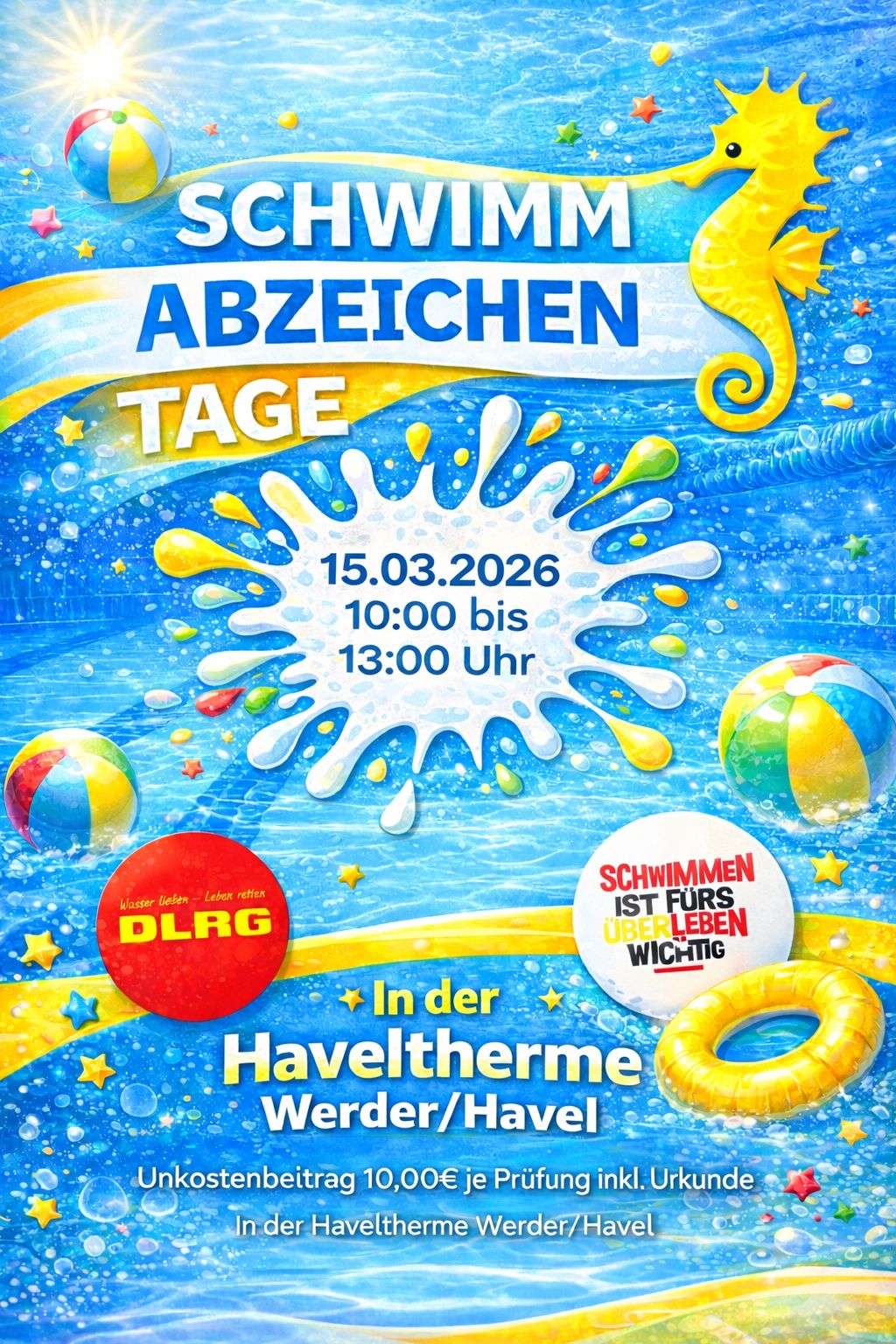 Eintritt ins Freibad zzgl. 10,00€ für Abnahme, Urkunde und Stoffabzeichen (wenn gewünscht).